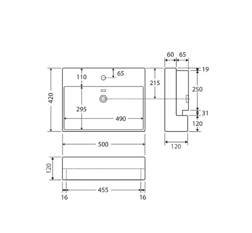 500*420*120mm FIE Petra Gloss White Ceramic Rectangle Semi Recessed Basin