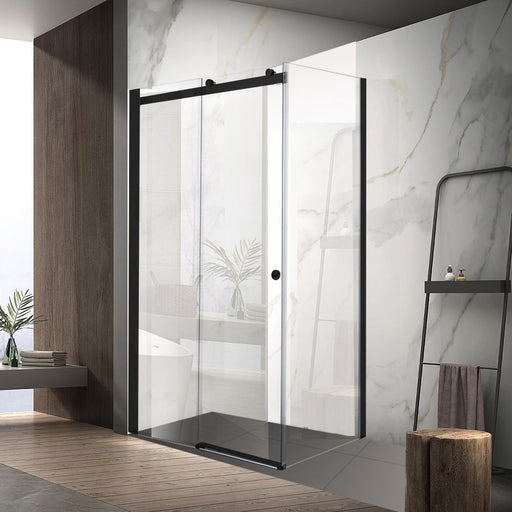 900-1800*2000mm SUN 8mm Glass Double Sliding L Shape Frameless Black Fittings Shower Screens