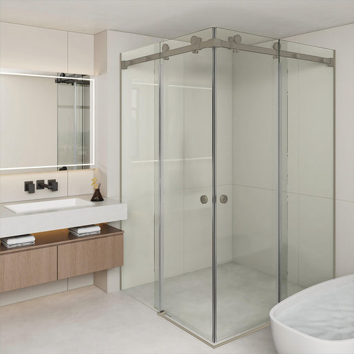 1180-2000x2000mm L Shape Sliding Frameless Brushed Nickel Square Rail Handle 10mm Glass Shower Screens