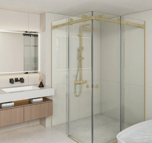 1180-2000x2000mm L Shape Sliding Frameless Light Gold Square Rail Handle 10mm Glass Shower Screens