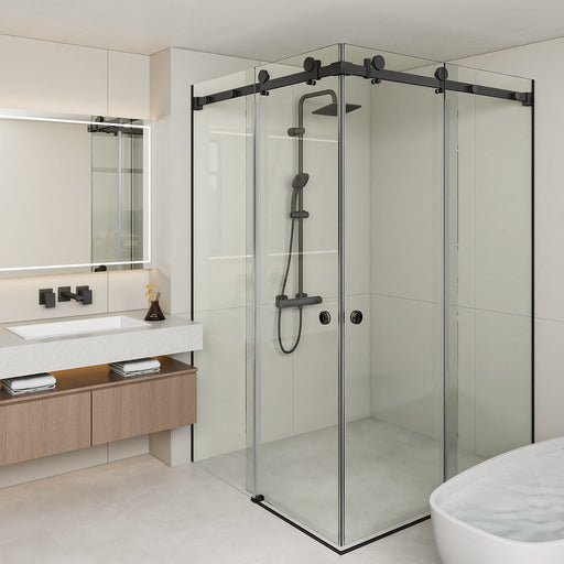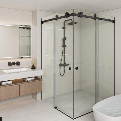 1180-2000x2000mm L Shape Sliding Frameless Black Square Rail Handle 10mm Glass Shower Screens