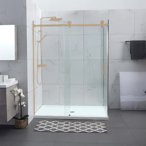 870-1180x2000mm Sliding L Shape Frameless Brushed Gold 10mm Glass Embedded Circle Handle Shower Screens