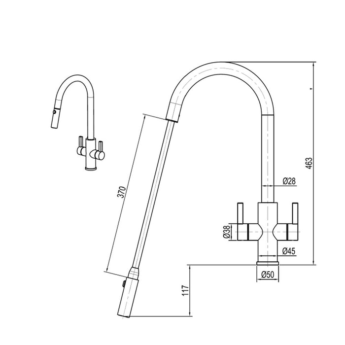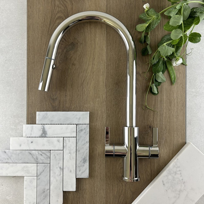 Suprema XPRESS FIT Xssence Satin/Chrome/Gun Metal 316 Stainless Steel Square Gooseneck With Lever Handles Retractable Tap